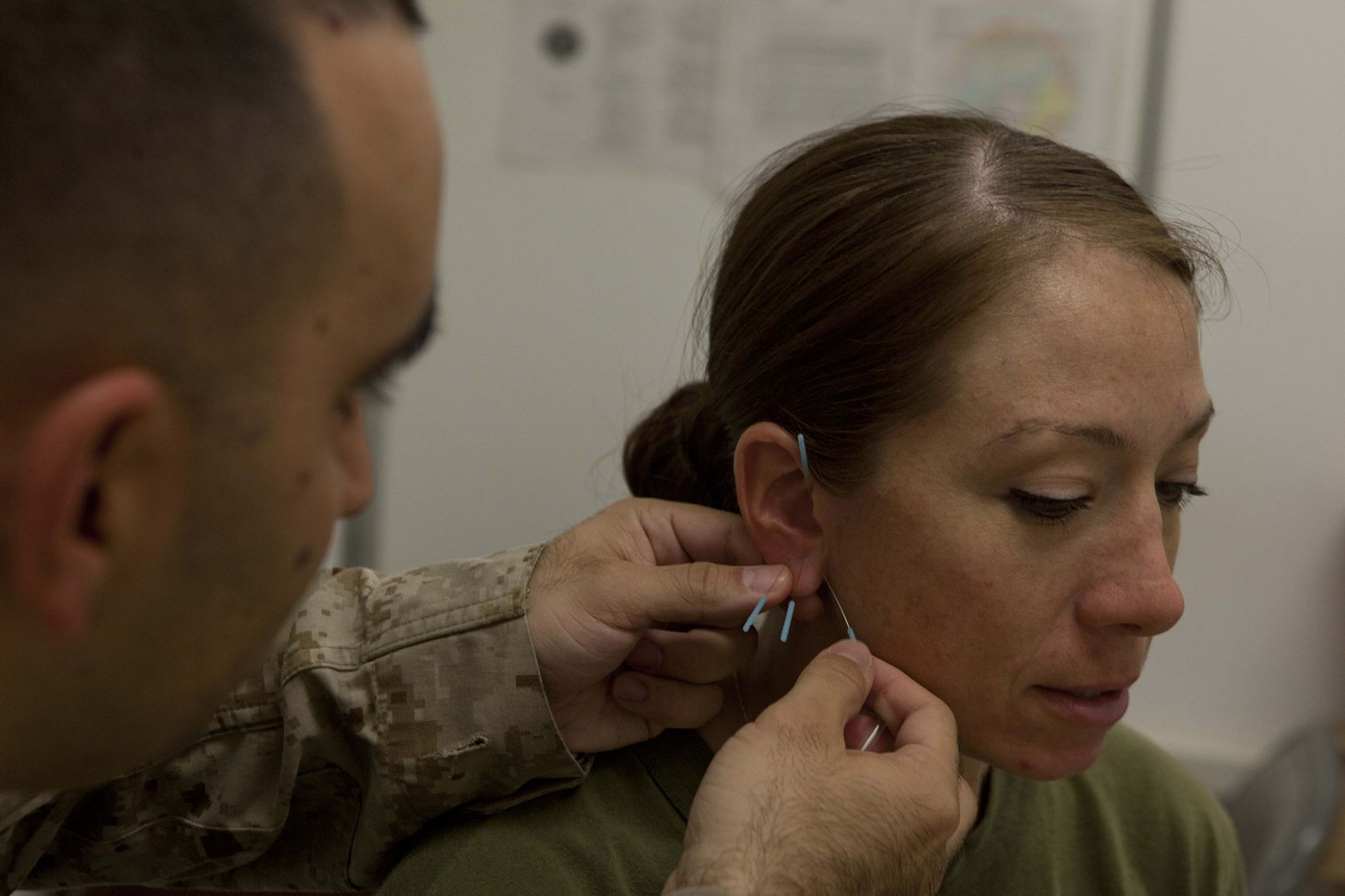 Militärarzt wendet Akupunktur an einer Patientin an